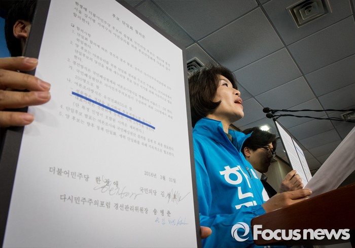 (서울=포커스뉴스) 한정애 더불어민주당 강서병 후보가 1일 오후 서울 여의도 국회 정론관에서 국민의당 김성호 후보와 단일화에 대한 기자회견을 하고 있다. 서울 강서병 지역 한정애 더민주 후보, 김성호 국민의당 후보 간의 단일화는 첫 수도권 단일화 합의로 관심을 모았으나 당명 사용 문제가 해결되지 않아 진통을 겪을 예상이다.