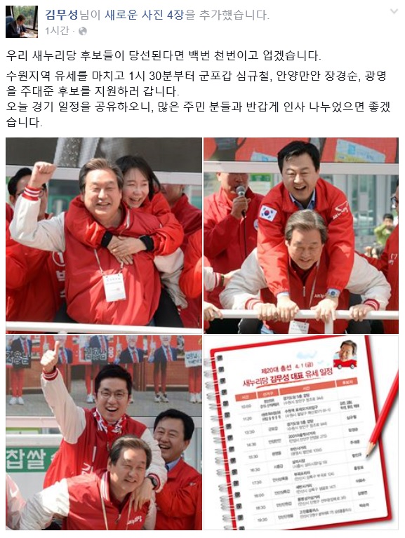 김 대표는 지난달 31일 이헌승(서울 서대문갑) 후보를 업어주며 "그동안 제가 각종 재보궐선거를 거치면서 업어줬던 사람은 전부 다 당선됐다"며 지원 사격을 아끼지 않았다.김무성 새누리당 대표가 수원 유세에 나서 독수리 5형제를 업은 사진을 페이스북에 게재했다. <출처= 김무성 대표 페이스북>