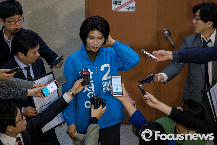 (서울=포커스뉴스) 한정애 더불어민주당 강서병 후보가 1일 오후 서울 여의도 국회 정론관에서 국민의당 김성호 후보와 단일화에 대한 기자회견을 하고 있다. 서울 강서병 지역 한정애 더민주 후보, 김성호 국민의당 후보 간의 단일화는 첫 수도권 단일화 합의로 관심을 모았으나 당명 사용 문제가 해결되지 않아 진통을 겪을 예상이다.