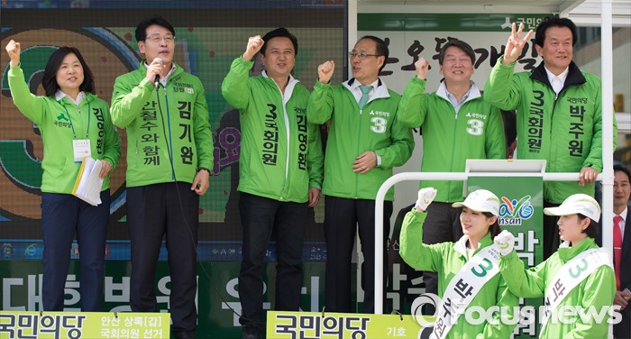 (안산=포커스뉴스) 안철수 국민의당 상임공동대표(오른쪽 두번째)가 1일 오후 안산시 상록구 상록수역 월드프라자 앞에서 김영환 상록구을 후보와 박주원 상록구갑 후보 지원 유세를 하고 있다. 오른쪽부터 박 후보, 안 대표, 비례대표후보 오세정 교수, 김 후보, 김기완 단원갑 후보