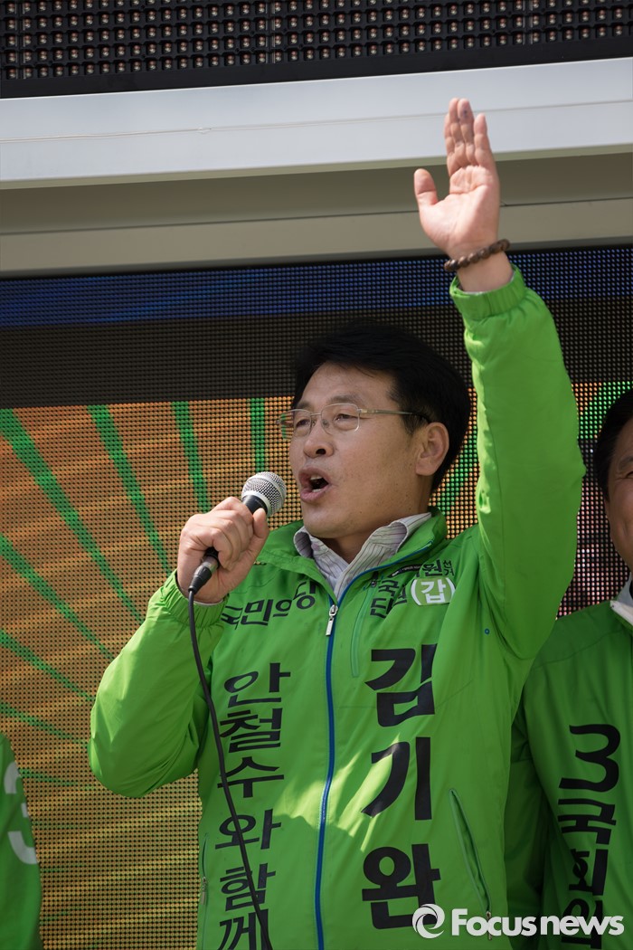 (안산=포커스뉴스) 김기완 국민의당 단원갑 후보가 1일 오후 안산시 상록구 상록수역 월드프라자 앞에서 김영환 상록구을 후보와 박주원 상록수갑 후보 지원 유세를 하고 있다.
