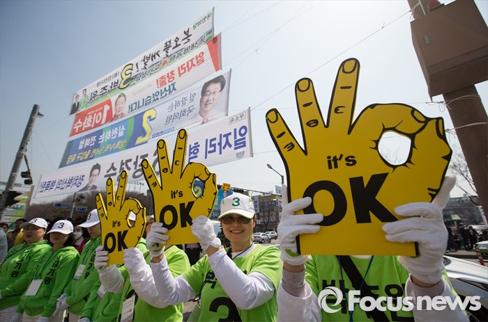 (안산=포커스뉴스) 국민의당 선거운동 봉사자들이 1일 오후 안산시 상록구 상록수역 월드프라자 앞에서 김영환 상록구을 후보와 박주원 상록구갑 후보 지원 유세를 하고 있다.