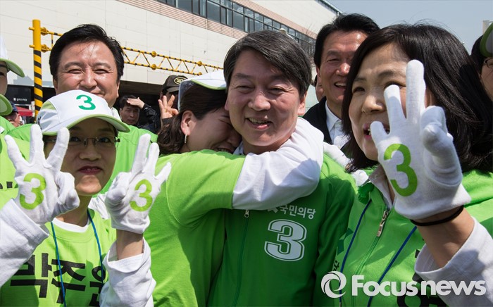 (안산=포커스뉴스) 안철수 국민의당 상임공동대표가 1일 오후 안산시 상록구 상록수역 월드프라자 앞에서 김영환 상록구을 후보와 박주원 상록구갑 후보 지원 유세를 하던 중 한 선거운동원에게 안기고 있다.