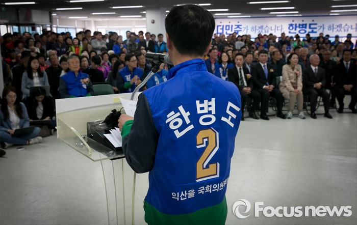 (익산=포커스뉴스) 한병도 더불어민주당 전북 익산을 후보가 1일 오후 자신의 선거사무소에서 열린 개소식에 참석해 내빈소개를 하고 있다.