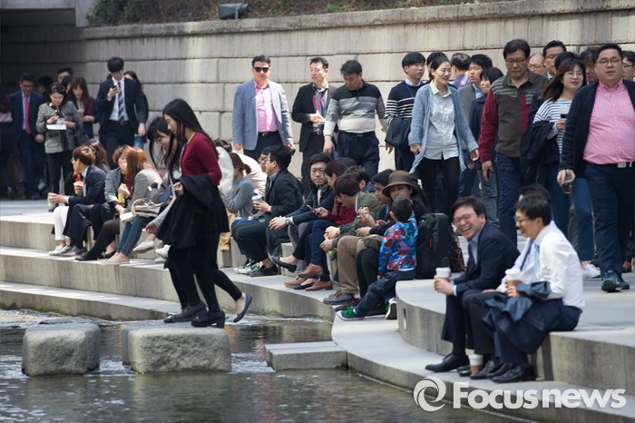(서울=포커스뉴스) 완연한 봄 날씨를 보인 1일 오후 서울 종로구 청계천을 찾은 시민들이 봄 날씨를 만끽하고 있다.