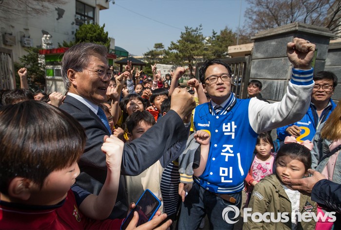 (서울=포커스뉴스) 1일 오후 문재인 전 더불어민주당 대표가 서울 은평구 역촌노인복지회관 인근에서 박주민 은평갑 후보와 함께 유세를 하고 있다.