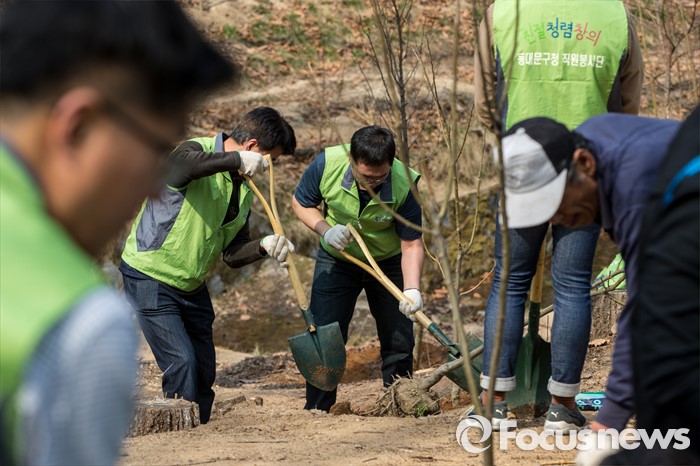 (서울=포커스뉴스) 1일 오후 서울 동대문구 배봉산에서 동대문구청 직원들이 식목일을 앞두고 나무를 심고 있다.
