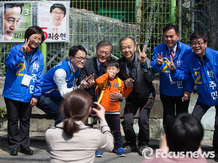 (서울=포커스뉴스) 1일 오후 문재인 전 더불어민주당 대표가 서울 은평구 역촌노인복지회관에서 박주민 은평갑 후보와 함께 유세를 하고 있다.