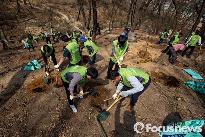 (서울=포커스뉴스) 1일 오후 서울 동대문구 배봉산에서 동대문구청 직원들이 식목일을 앞두고 나무를 심고 있다.