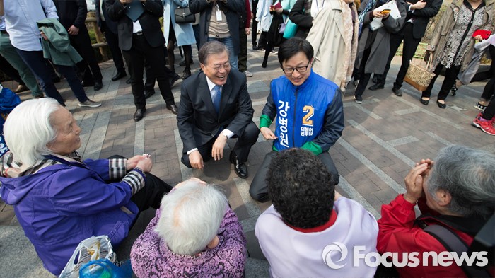 (서울=포커스뉴스) 1일 오후 문재인 전 더불어민주당 대표가 서울 은평구 연신내역 앞에서 강병원 은평을 후보와 함께 유세를 하고 있다.