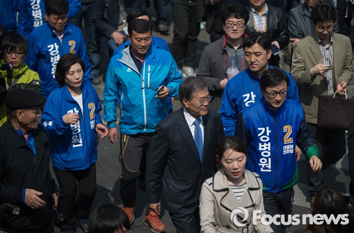 (서울=포커스뉴스) 1일 오후 문재인 전 더불어민주당 대표가 서울 은평구 연신내역 앞에서 강병원 은평을 후보와 함께 유세를 하고 있다.
