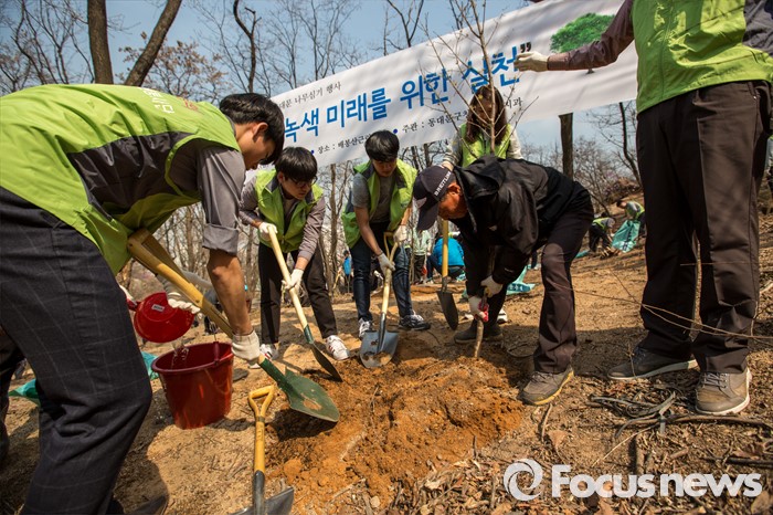 (서울=포커스뉴스) 1일 오후 서울 동대문구 배봉산에서 동대문구청 직원들이 식목일을 앞두고 나무를 심고 있다.