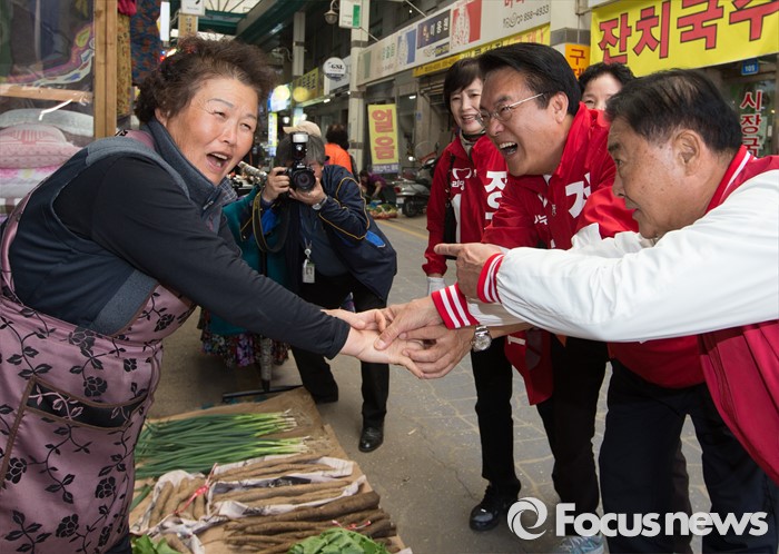 (공주=포커스뉴스) 1일 충남 공주시 산성시장 일원에서 강창희 전 국회의장이 시민들에게 정진석 새누리당 후보를 지지해줄 것을 호소하고 있다.