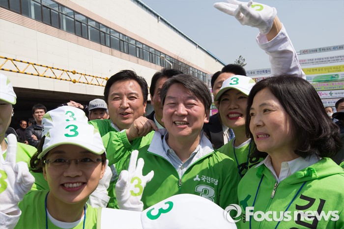 (안산=포커스뉴스) 안철수 국민의당 상임공동대표(가운데)와 김영환 상록구을 후보(안 대표 왼쪽)가 1일 오후 안산시 상록구 상록수역 월드프라자 앞에서 선거 유세를 하던 중 선거운동원들과 함께 기념사진을 찍고 있다.