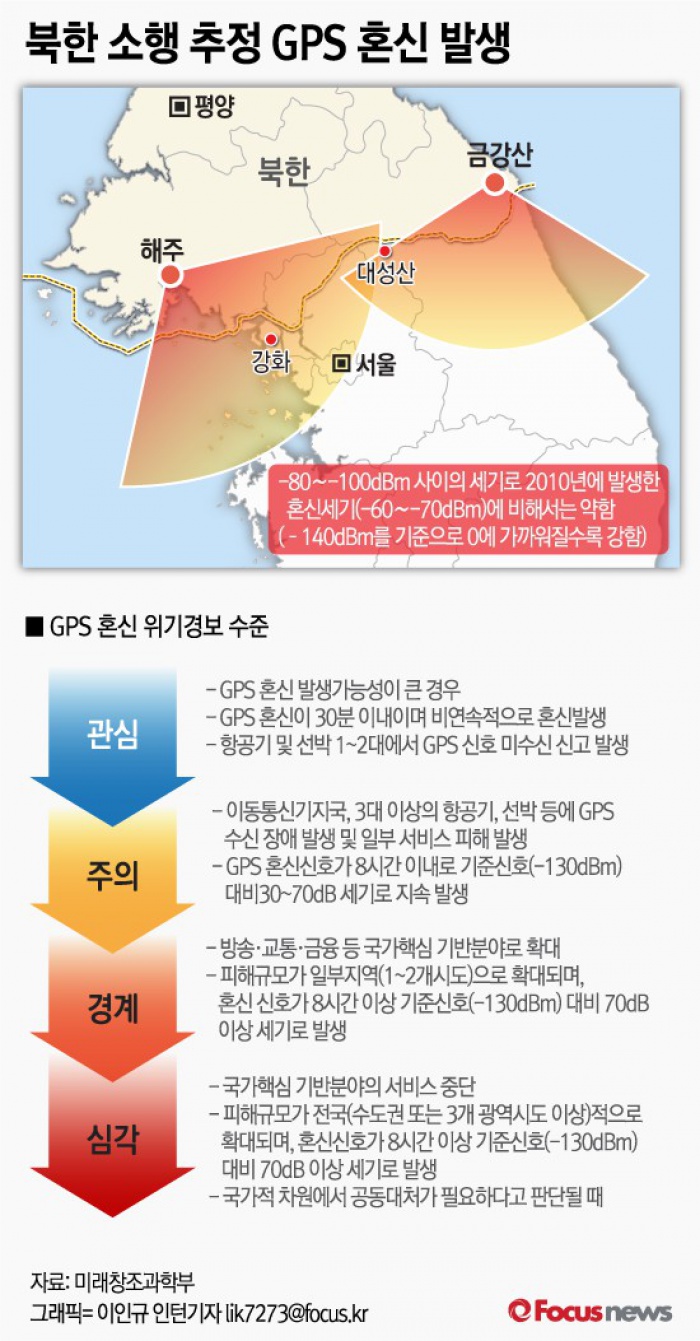 (서울=포커스뉴스) 31일 미래창조과학부는 당일 오후 7시 36분부터 GPS 혼신이 발생했다고 밝혔다. 혼신원은 북한 해주와 금강산 일대로 추정되며, 혼신 세기는 강화지역 70데시벨, 대성산 지역 100데시벨이다.