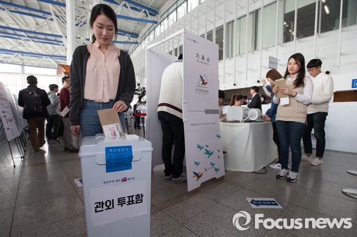 (서울=포커스뉴스) 1일 오후 서울 용산구 서울역사에 설치된 제20대 국회의원선거 투표참여 홍보관에서 시민들이 사전투표 체험을 하고 있다. 체험관은 이달 1일부터 6일까지 운영한다.