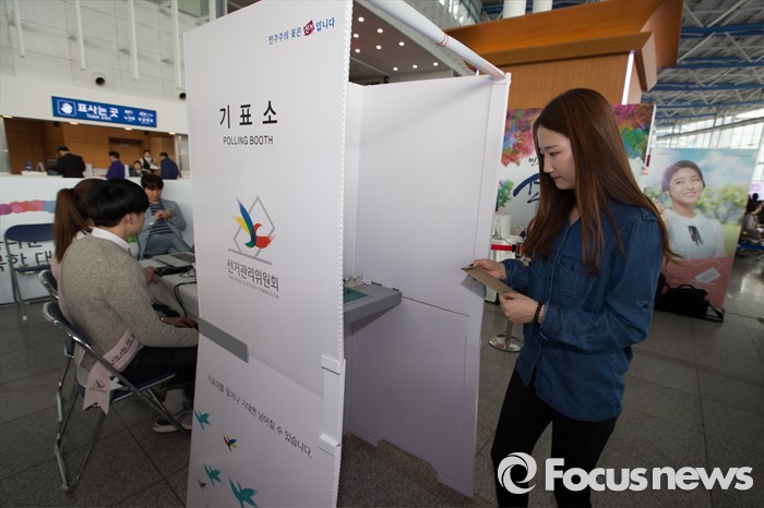 (서울=포커스뉴스) 1일 오후 서울 용산구 서울역사에 설치된 제20대 국회의원선거 투표참여 홍보관에서 시민들이 사전투표 체험을 하고 있다. 체험관은 이달 1일부터 6일까지 운영한다.