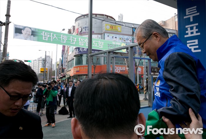 (완주=포커스뉴스) 1일 오후 전북 완주군 둔산공원 앞 사거리에서 김종인(오른쪽) 더불어민주당 비대위 대표가 안호영 완주·진안·무주·장수군 후보 유세를 마친 뒤 차량에서 내려오고 있다.