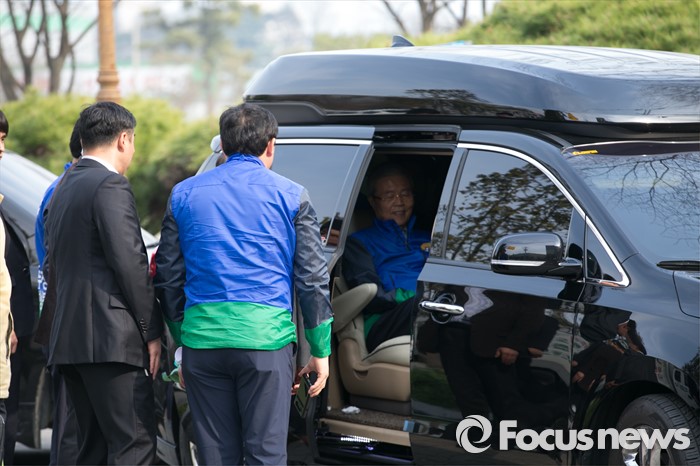(완주=포커스뉴스) 1일 오후 전북 완주군 둔산공원 앞 사거리에서 김종인 더불어민주당 비대위 대표가 안호영 완주·진안·무주·장수군 후보 유세를 마친 뒤 차량에 올라 이동하고 있다.