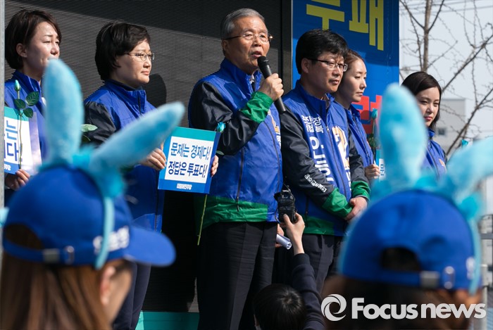 (완주=포커스뉴스) 1일 오후 전북 완주군 둔산공원 앞 사거리에서 김종인(왼쪽 세번째) 더불어민주당 비대위 대표 겸 선대위원장이 안호영(왼쪽 네번째) 완주·진안·무주·장수군 후보의 지지를 호소하고 있다.