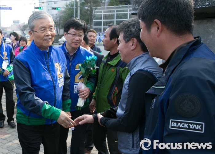 (완주=포커스뉴스) 1일 오후 전북 완주군 둔산공원 앞 사거리에서 김종인(왼쪽) 더불어민주당 비대위 대표가 유세를 마친 뒤 시민 및 지지자들과 인사하고 있다.