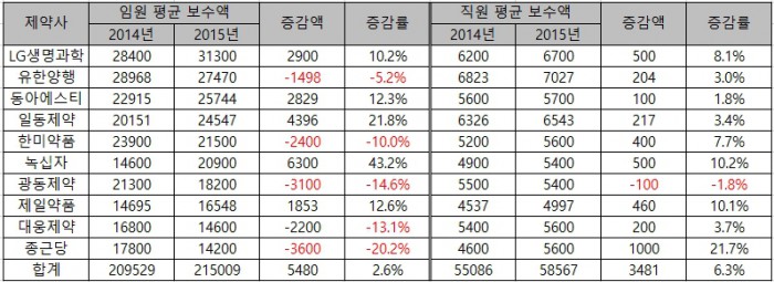 1일 포커스뉴스가 매출 상위 10대 제약사의 사업보고서를 토대로 임원 및 직원 평균 연봉을 분석한 결과 이같이 조사됐다.