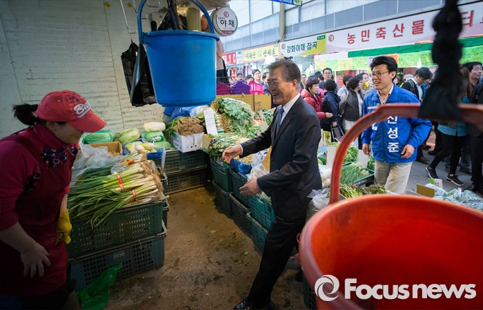 (서울=포커스뉴스) 1일 오후 문재인 전 더불어민주당 대표가 서울 강서구 방신재래시장에서 진성준 강서을 후보와 함께 유세를 하고 있다.