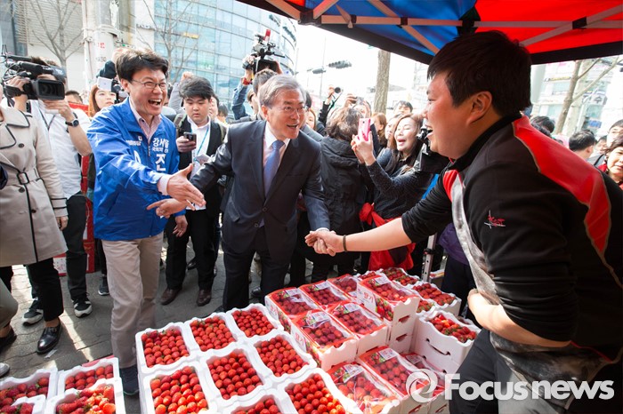 (서울=포커스뉴스) 1일 오후 문재인 전 더불어민주당 대표가 서울 강서구 방신재래시장에서 진성준 강서을 후보와 함께 유세를 하고 있다.