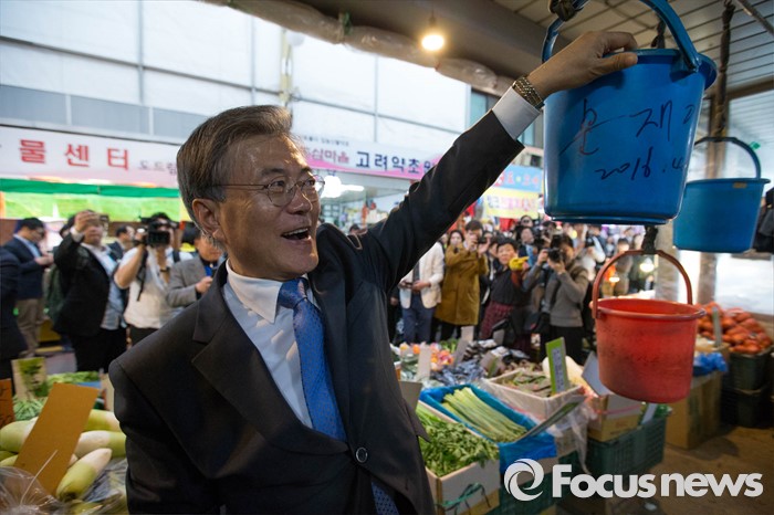 (서울=포커스뉴스) 1일 오후 문재인 전 더불어민주당 대표가 서울 강서구 방신재래시장에서 진성준 강서을 후보와 함께 유세를 하고 있다.