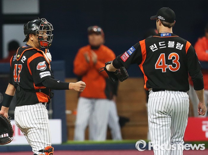 (서울=포커스뉴스) 1일 오후 서울 구로구 고척스카이돔에서 열린 2016 타이어뱅크 프로야구 개막전 넥센 히어로즈와 롯데 자이언츠의 경기에서 롯데 선발 린드블럼이 2회 투구를 마친 후 포수 강민호와 대화를 나누며 더그아웃으로 향하고 있다.