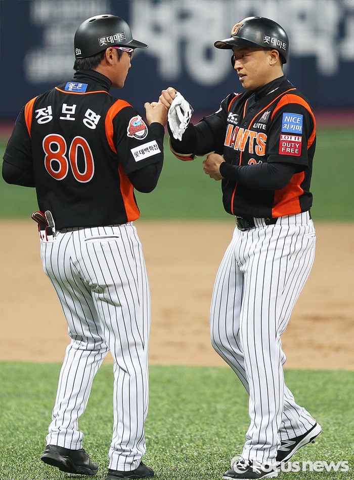 (서울=포커스뉴스) 1일 오후 서울 구로구 고척스카이돔에서 열린 2016 타이어뱅크 프로야구 개막전 넥센 히어로즈와 롯데 자이언츠의 경기 3회초 1사 상황 롯데 손아섭이 2루타를 친 뒤 정보명 코치와 하이파이브를 하고 있다.