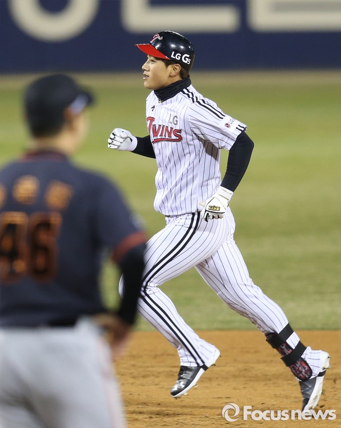 (서울=포커스뉴스) 1일 서울 잠실구장에서 열린 2016프로야구 개막전 한화-LG 경기에서 2회말 1사 1루에서 LG 이천웅이 우월 2점 홈런을 날리고 그라운드를 돌고 있다.