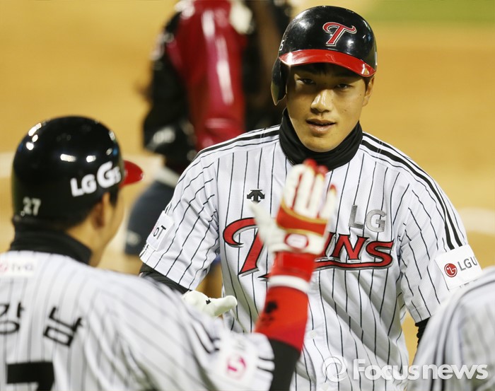 (서울=포커스뉴스) 1일 서울 잠실구장에서 열린 2016프로야구 개막전 한화-LG 경기에서 2회 1사후 LG 이천웅이 우월 2점 홈런을 날리고 유강남의 환영을 받으며 홈인하고 있다.