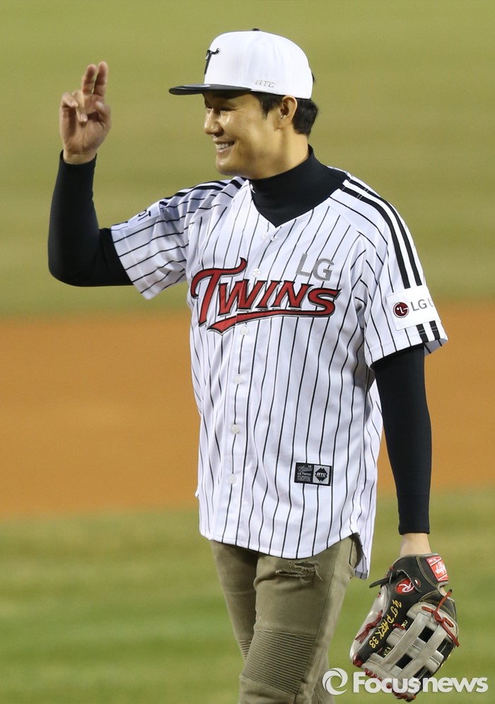 (서울=포커스뉴스) 1일 서울 잠실구장에서 열린 2016프로야구 개막전 한화-LG 경기에서 배우 박성웅이 시구를 한 후 팬을 향해 인사하고 있다.