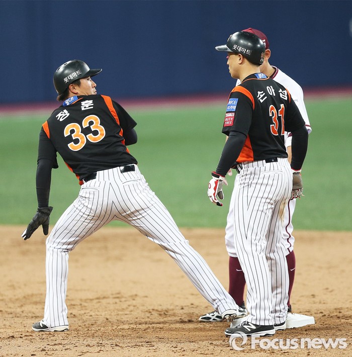 (서울=포커스뉴스) 1일 오후 서울 구로구 고척스카이돔에서 열린 2016 타이어뱅크 프로야구 개막전 넥센 히어로즈와 롯데 자이언츠의 경기 7회초 1사 1,2루 상황 유격수 내야 땅볼로 롯데 정훈과 손아섭이 2루에서 만나고 있다. 손아섭은 포스아웃 당했다.