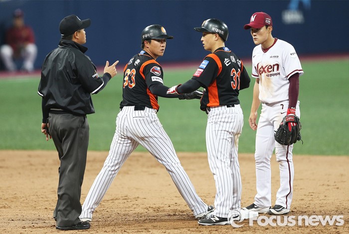(서울=포커스뉴스) 1일 오후 서울 구로구 고척스카이돔에서 열린 2016 타이어뱅크 프로야구 개막전 넥센 히어로즈와 롯데 자이언츠의 경기 7회초 1사 1,2루 상황 유격수 내야 땅볼로 롯데 정훈과 손아섭이 2루에서 만나고 있다. 손아섭은 포스아웃 당했다.