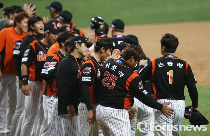 (서울=포커스뉴스) 1일 오후 서울 구로구 고척스카이돔에서 열린 2016 타이어뱅크 프로야구 개막전 넥센 히어로즈와 롯데 자이언츠의 경기에서 롯데가 2:1로 승리한 후 환호하고 있다.