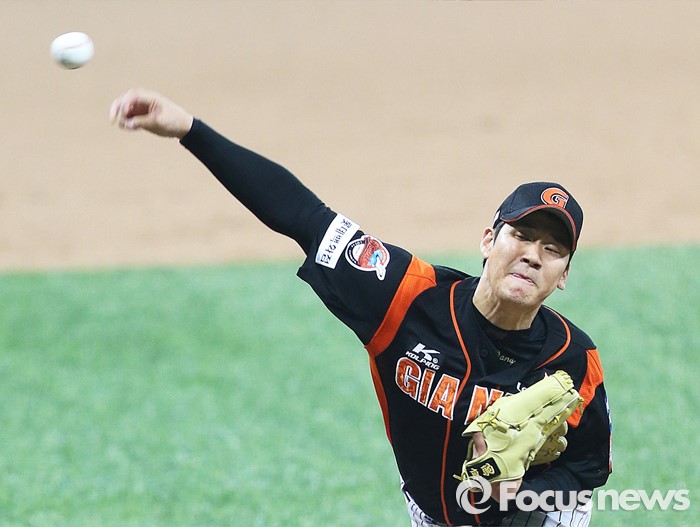 (서울=포커스뉴스) 1일 오후 서울 구로구 고척스카이돔에서 열린 2016 타이어뱅크 프로야구 개막전 넥센 히어로즈와 롯데 자이언츠의 경기 8회말 롯데 다섯번째 투수 윤길현이 투구하고 있다.