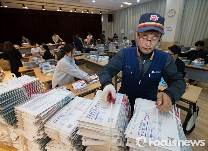 (서울=포커스뉴스)제20대 국회의원 선거 공보물 정리 작업이 진행된 2일 오후 서울 안암동 주민센터에서 집배원이가정으로 전달될 공보물들을 옮기고 있다.