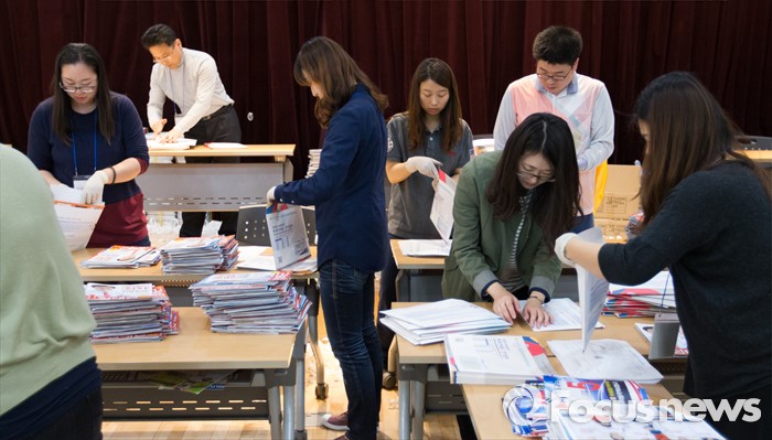 (서울=포커스뉴스) 2일 오후 서울 성북구 안암동주민센터에서 관계자들이 가정으로 발송될 제20대 국회의원 선거 공보물을 정리하고 있다.