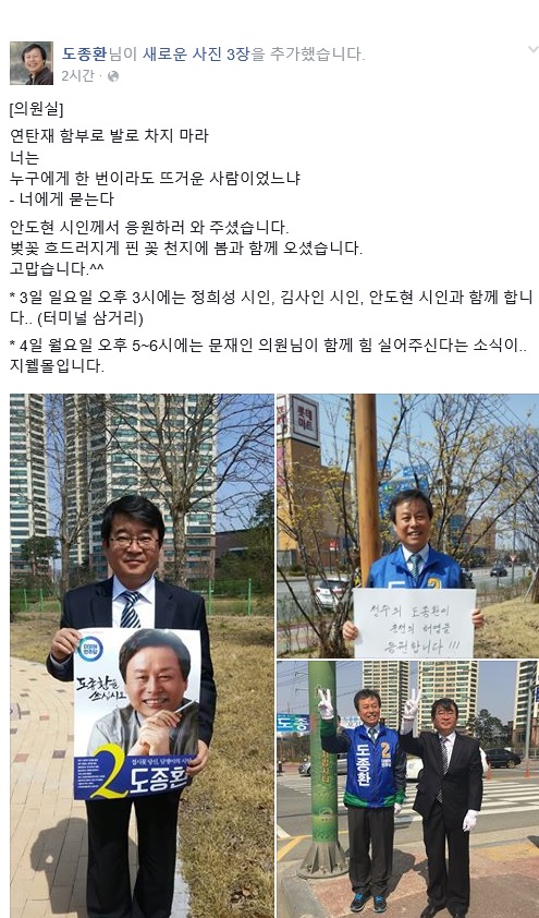 도 후보는 안 시인의 대표시인 연탄재를 인용하며 "(안 시인이) 벚꽃 흐드러지게 핀 꽃 천지에 봄과 함께 오셨다. 고맙다"고 감사의 뜻을 전했다.