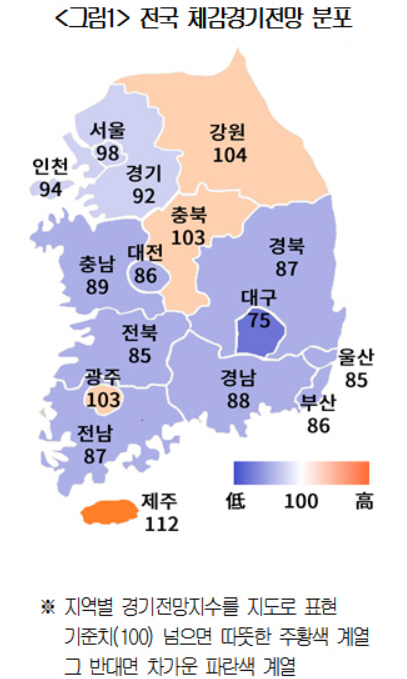 다만, 서울(98), 인천(94), 경기(92), 충남(89), 경남(88), 경북(87), 전남(87), 부산(86), 대전(86), 울산(85), 전북(85), 대구(75) 등 나머지 지역은 아직 기준치(100)를 넘어서지 못했다.