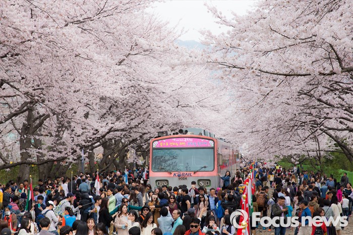 (창원=포커스뉴스) 2일 오후 경남 창원시 진해구 경화역을 찾은 관광객들이 만개한 벚꽃을 보며 즐거운 시간을 보내고 있다.