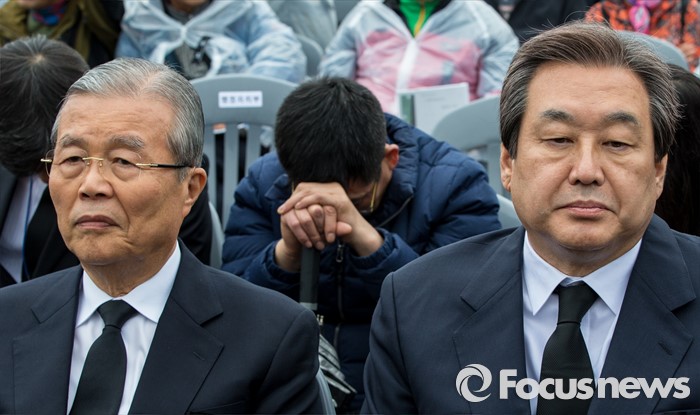 (제주=포커스뉴스) 3일 오전 제주 4ㆍ3 평화공원에서 열린 제68주년 4ㆍ3희생자 추념식에 참석한 김무성(오른쪽) 새누리당 대표와 김종인 더불어민주당 비상대책위원회 대표가 식의 시작을 기다리고 있다.