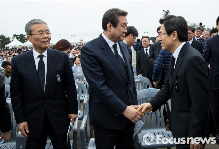 (제주=포커스뉴스) 3일 오전 제주 4ㆍ3 평화공원에서 열린 제68주년 4ㆍ3희생자 추념식에 참석한 황교안(맨 오른쪽) 국무총리가 김무성 새누리당 대표, 김종인 더불어민주당 비상대책위원회 대표와 악수하고 있다.