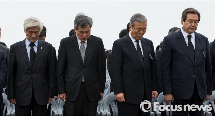 (제주=포커스뉴스) 3일 오전 제주 4ㆍ3 평화공원에서 열린 제68주년 4ㆍ3희생자 추념식에 참석한 김세균(왼쪽부터) 정의당 공동대표, 이상돈 국민의당 공동선대위원장, 김종인 더불어민주당 비상대책위원회 대표, 김무성 새누리당 대표가 희생자들을 애도하는 묵념을 하고 있다.
