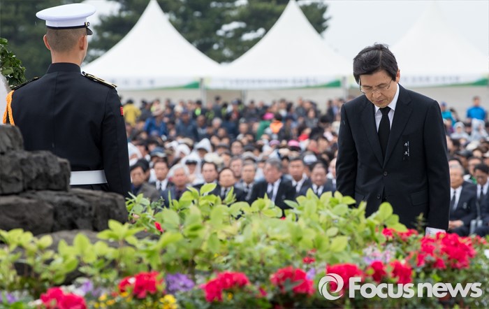 (제주=포커스뉴스) 3일 오전 제주 4ㆍ3 평화공원에서 열린 제68주년 4ㆍ3희생자 추념식에 참석한 황교안 국무총리가 분향 후 묵념하고 있다.