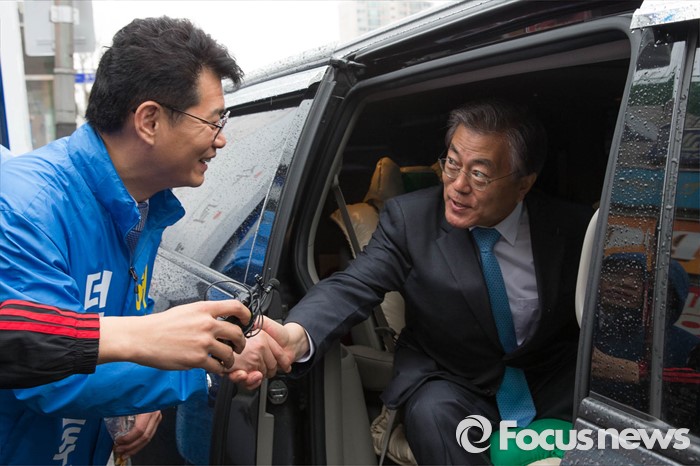 (서울=포커스뉴스) 선거운동이 시작되고 첫 주말을 맞은 3일 오후 문재인 전 더불어민주당 대표가 서울 동작구 남성시장에서 허동준 더불어민주당 동작을 후보와 악수하고 있다.