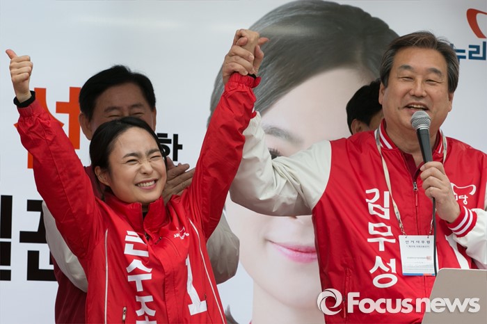 (부산=포커스뉴스) 김무성(오른쪽) 새누리당 대표가 3일 오후 부산광역시 사상구 광장로의 한 대형마트 앞에서 손수조 사상구 후보 지원유세에 참석해, 손 후보의 손을 들고 있다.