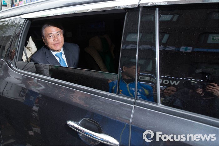 (서울=포커스뉴스) 선거운동이 시작되고 첫 주말을 맞은 3일 오후 문재인 전 더불어민주당 대표가 서울 중구 중앙시장에서 이지수 더불어민주당 중구 성동을 후보와 합동유세를 마치고 이동하고 있다.
